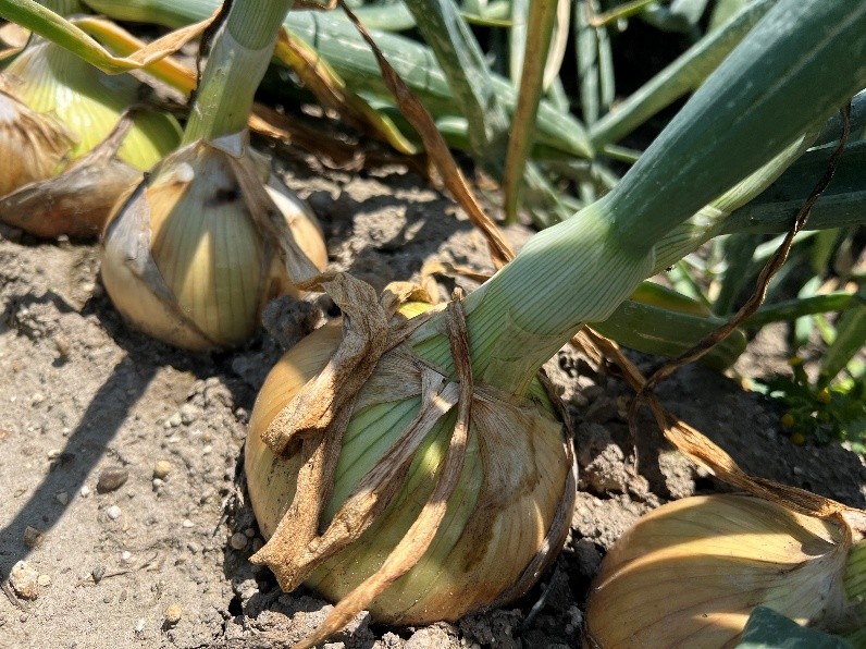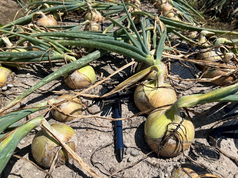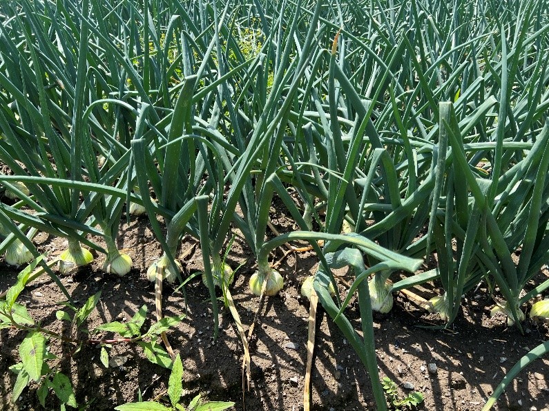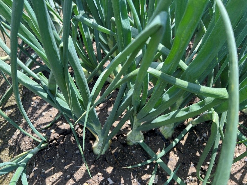 低温乾燥状態で推移していたが、5月上旬の降雨、中旬の高温、夜間低温で肥効がみられ分球と肥大が進んでおり、晩生種の品質劣化防止のため、中生種の収穫に先んじて晩生種の収穫を優先している。