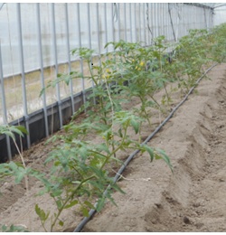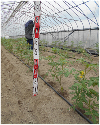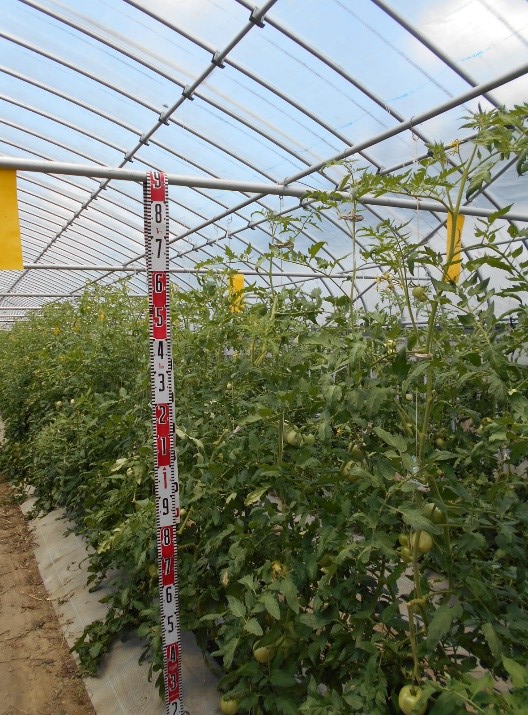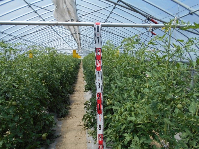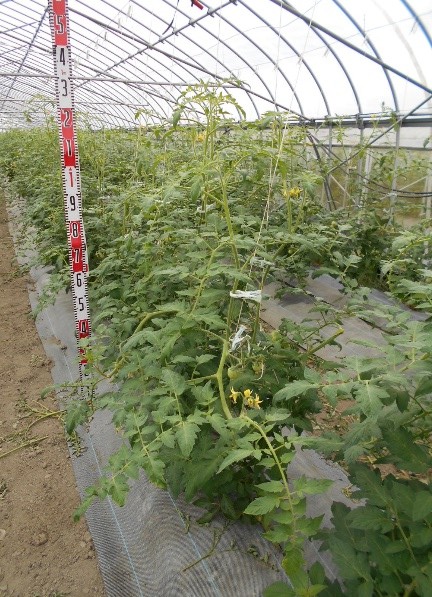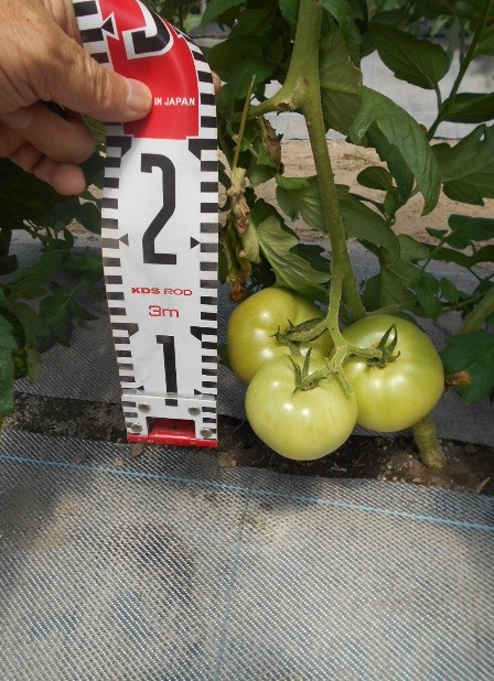 - 1枚目:4月18日定植、右列「桃太郎みなみ」、左列「麗月」品種による生育差はみられない