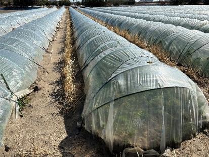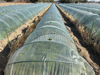 - トンネル5条植え、換気を行うため目印に棒を立てる