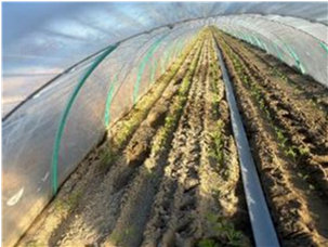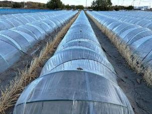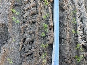 - 1畝5条植えで、本葉2~3枚程度、生育は例年並み