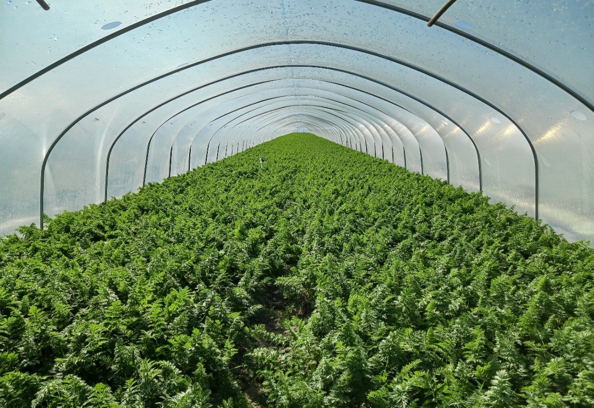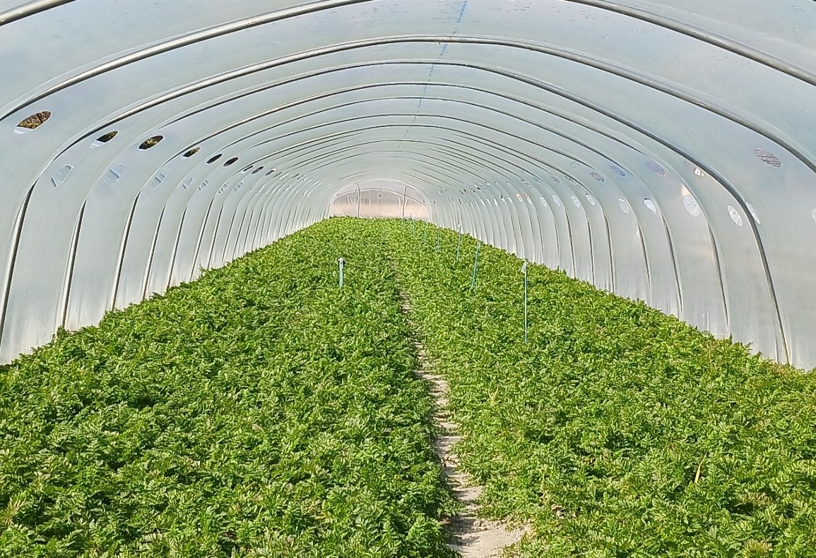 トンネル栽培でミニパイプハウスや大型トンネルを使用している。現在は、11月中旬播種分を出荷しているが、低温干ばつの影響を受け、品質は良いものの小玉傾向となっている。