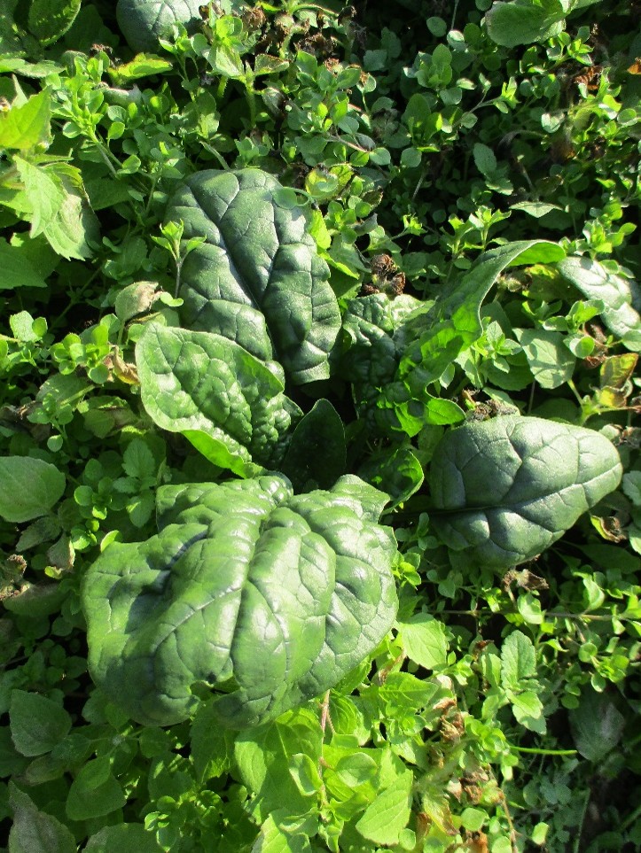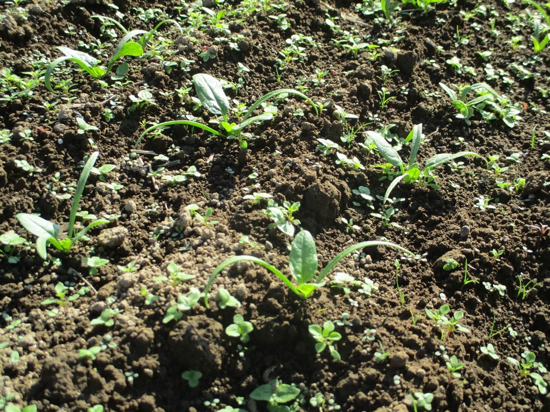 9月12日頃から播種を開始。暑い日が続いているため雑草が目立つが、横に広がるほうれんそうの葉に土がつきにくく生育に影響はない。