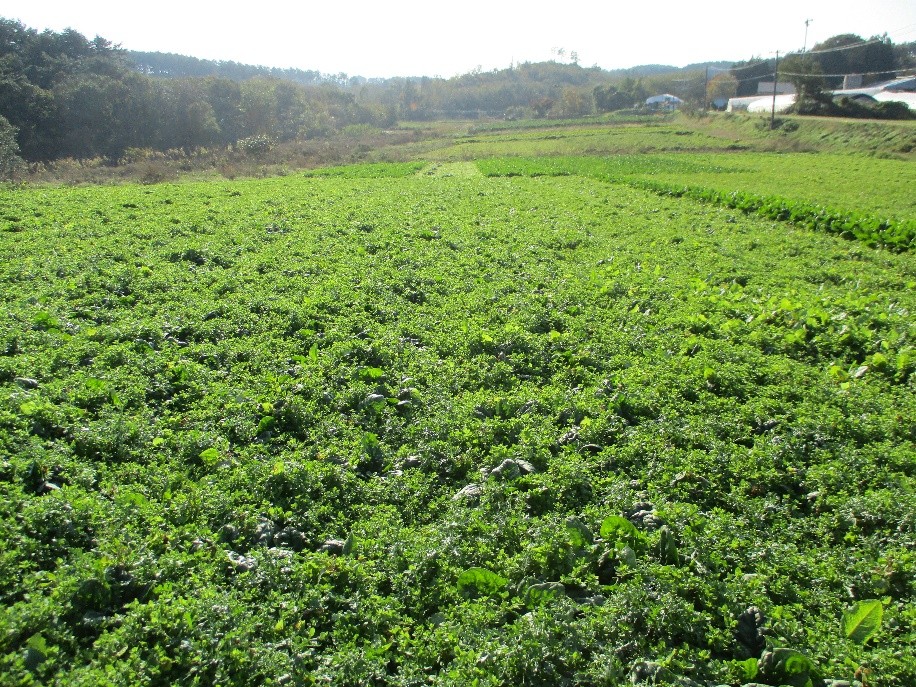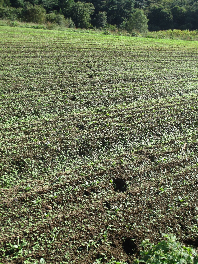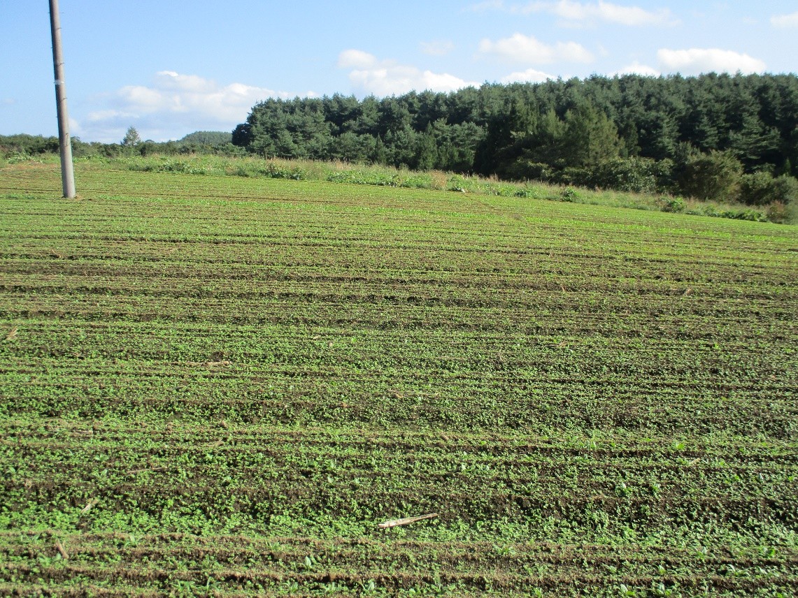 - 1、2枚目:9月上旬に播種、雑草が繁殖しているが生育は順調